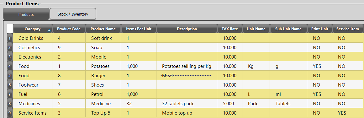 For service item column, enter y (short of Yes), or n (short for No), and same is the case for print unit name column if you want to print the unit name of the product on receipts.