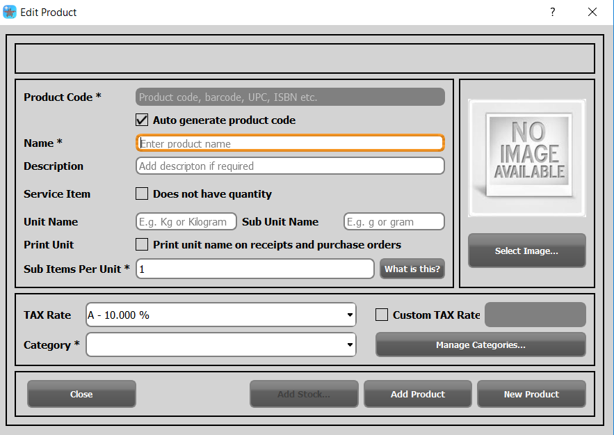 Purchase Unit Cost: Please enter the unit cost of stock item. For example, if the stock consists of 50 Samsung Mobile Phones, you would enter here the purchase of one mobile phone. This information will be used in calculating your profit margins on sales. In most cases this cost will be inclusive of tax and other costs related to purchase.