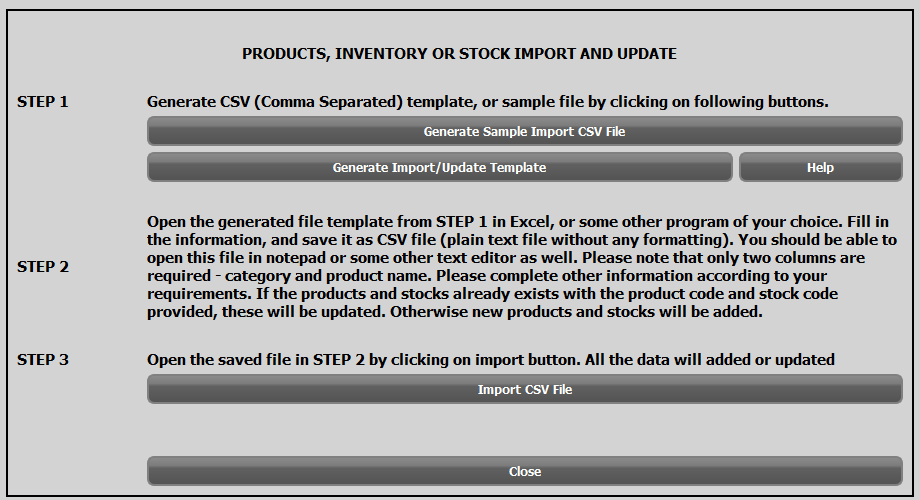 This utility is for importing existing data in spread sheet in the CSV format, and updating products and inventory data. Please enter the data in file according to your requirements and whatever is available. Only two fields are required, i.e. category and product name. If no product code is provided, a new product code will be assigned to product automatically, same is the case for stock code. If no stock code is provided a new code will be generated and assigned to stock. If the code is provided (both for product and stock), and the code already exists in the system, system will update the existing product and stock data.