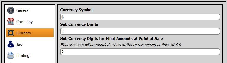 Sub Currency Digits for Final Amounts at Point of Sale: This setting will affect how the final due amounts at point of sale will rounded off. For example, if this setting is set to 0 and final due amount to be paid turns out to be $90.80. This amount will be rounded off to $91 according to this setting. Similarly if this setting is set to 1, then only one digit after decimal will be retained and a due amount of $90.47 will be rounded off to $90.50.