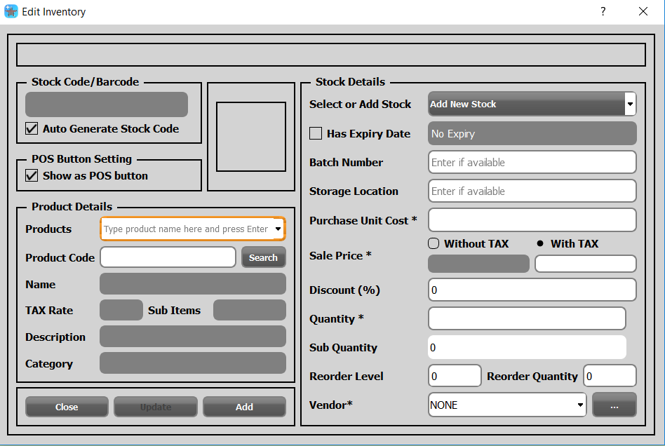 Scanner Code: This field is shown only when you enable it from the settings dialog. This will capture codes generated from the barcode scanner. Alternatively you can also use this field manually by entering a stock code in this field and pressing Enter key on your keyboard.