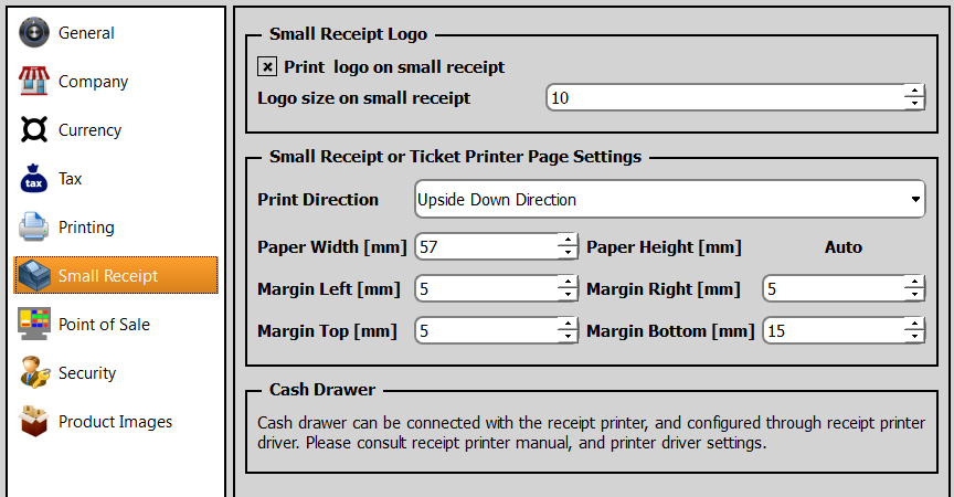 Point of Sale Printing: These settings determines whether you want to print large receipts or invoices (e.g. A4 size), or small receipts (tickets). If you have selected large size, then point of sale printer should be able to print large size receipts. Similarly if you have selected small receipts, then point of sale printer should be able to print receipts or tickets.