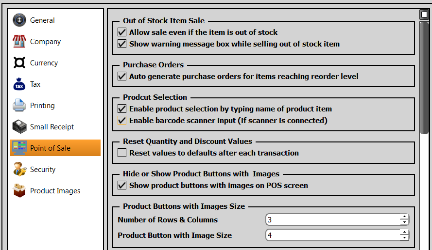 Point of Sale Buttons: These are the buttons with pictures shown on the right side of the POS screen. You can add products to sale by simply pressing these buttons. If you do not want to show these buttons on the POS screen then uncheck the box labeled as “Show POS Buttons Tab”. This will hide the whole tab.