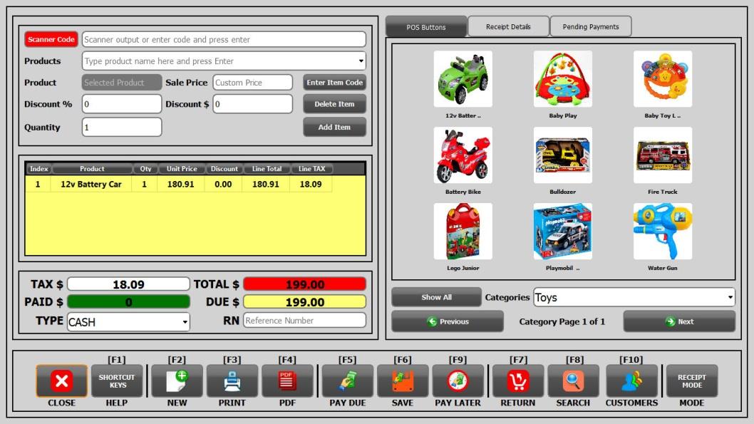 MODE: Mode button allows you to switch between invoice or receipt mode. In invoice mode you can additionally set the payment status, and due date. Printing format of invoice is also different from the receipt. Receipt mode normally refers to normal transactions performed at the retail outlets.
